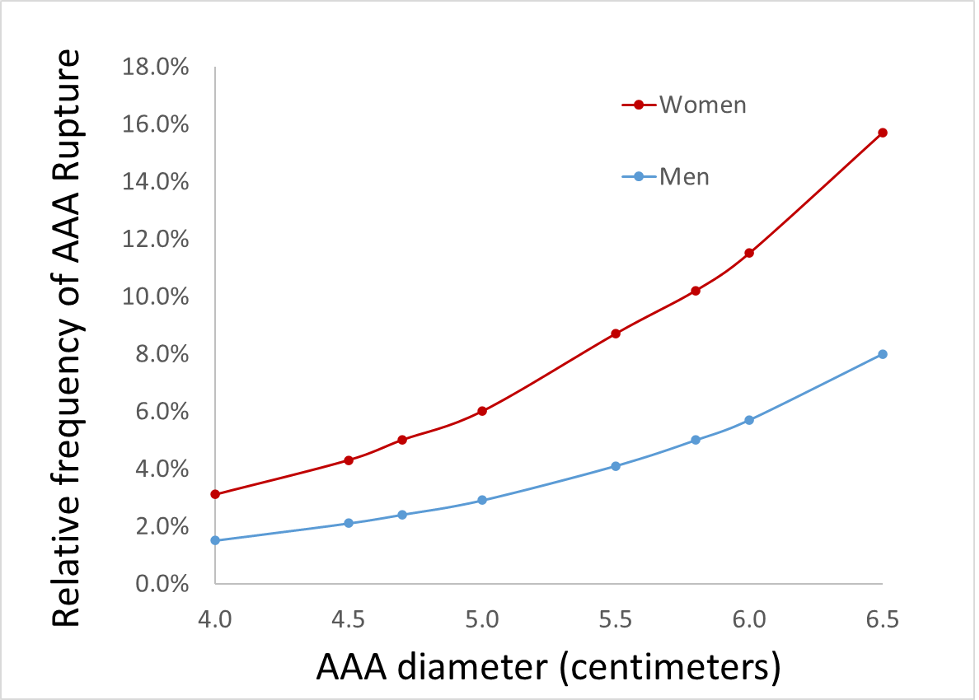 At any given aneurysm size, women are more likely to experience a rupture than men. Historically, women were also less likely to be offered repair — whether for an intact or ruptured aneurysm — and less likely to survive to hospital discharge after surgery. [2]